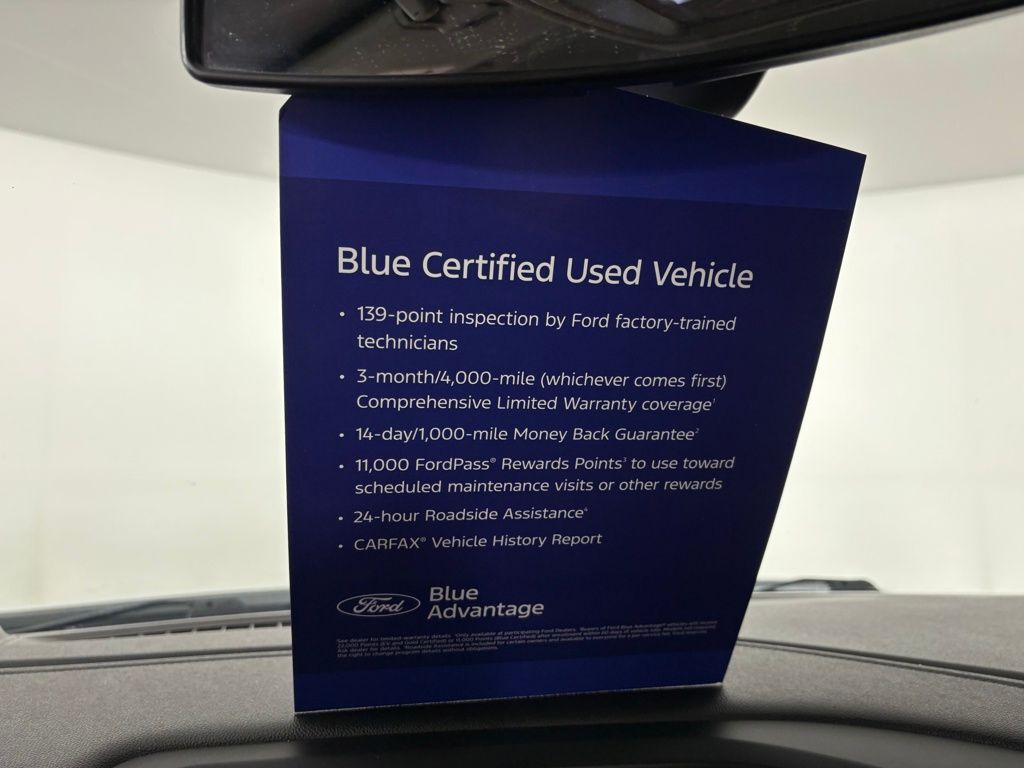 Ford Blue Certified includes:139 point vehicle inspection performed by an ASE Certified technician 3-month/4,000-mile Comprehensive Limited Warranty coverage that is fully competitive with other online retailers Blue Certification includes 11,000 FordPass Rewards Points For other manufacturers not listed above, Comprehensive Coverage is provided fo