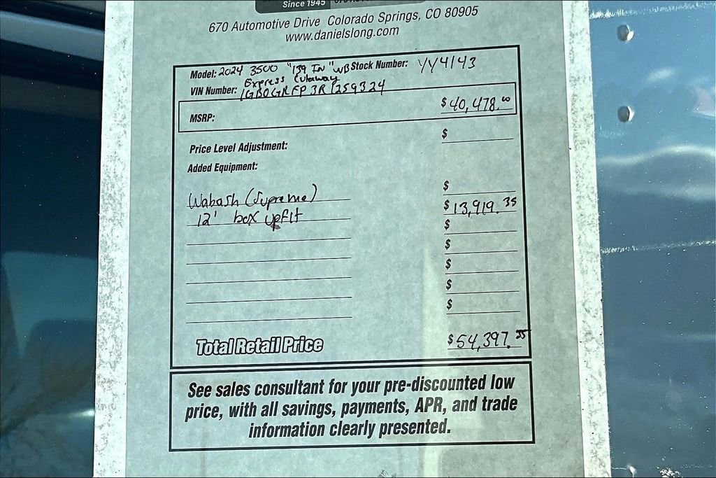 Chrome Appearance Package (Chrome Grille and Front Chrome Bumper w/Step-Pad), Driver Convenience Package (Tilt Steering Wheel), Power Convenience Package (Power Door Locks w/Lock-Out Protection and Power Windows), Preferred Equipment Group 1WT, 2 Speakers, 3.42 Rear Axle Ratio, 4-Wheel Disc Brakes, ABS brakes, Air Conditioning, AM/FM radio, Antenna Equipment, Body Soft-Mount Donut & Bolt, Cruise Control, Delay-off headlights, Driver & Front Passenger High-Back Bucket Seats, Driver door bin, Driver's Seat Mounted Armrest, Dual front impact airbags, Dual front side impact airbags, Electronic Stability Control, Emergency communication system: OnStar and Chevrolet connected services capable, Engine Cover Console w/Swing-Out Storage Bin, Exterior Parking Camera Rear, Front anti-roll bar, Front Bucket Seats, Front wheel independent suspension, Fully automatic headlights, Heavy-Duty Locking Rear Differential, Inside Rearview Mirror w/Rr Vision Camera Display, Low tire pressure warning, Occupant sensing airbag, Overhead airbag, Passenger cancellable airbag, Passenger door bin, Passenger seat mounted armrest, Power steering, Radio: AM/FM Stereo w/MP3 Player & Digital Clock, Reclining High-Back Bucket Seats w/Inboard Armrests, Remote Keyless Entry, Single Rear Wheel Configuration, Tachometer, Theft Alarm Notification, Traction control, Trip computer, Variably intermittent wipers, Vinyl Seat Trim, Voltmeter, Wheels: 16 x 6.5 8-Lug Painted Steel HD (4), and Wide-Stance Sail Panel Mounted Outside Mirrors. Price includes: $1500 - Customer Cash. Exp. 01/02/2026
