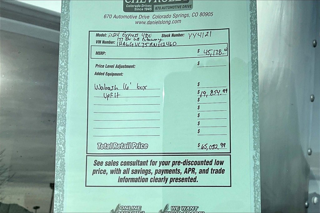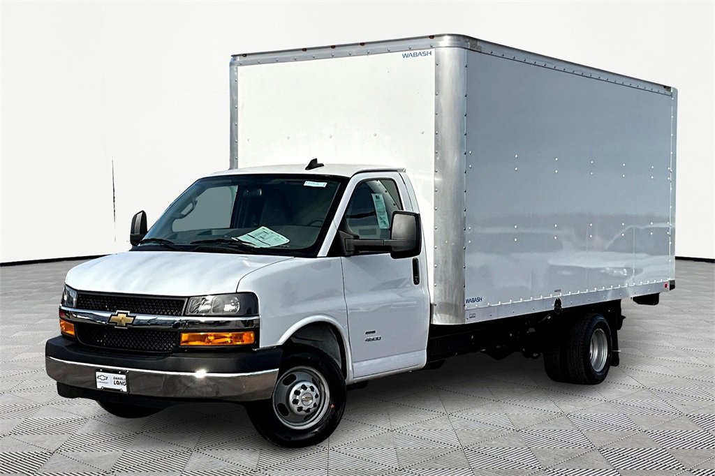 Chrome Appearance Package (Chrome Grille and Front Chrome Bumper w/Step-Pad), Driver Convenience Package (Cruise Control and Tilt Steering Wheel), Power Convenience Package (Power Door Locks w/Lock-Out Protection and Power Windows), Preferred Equipment Group 2WT, 2 Speakers, 4-Wheel Disc Brakes, 4.10 Rear Axle Ratio, ABS brakes, Air Conditioning, AM/FM radio, Antenna Equipment, Body Soft-Mount Donut & Bolt, Delay-off headlights, Driver & Front Passenger High-Back Bucket Seats, Driver door bin, Driver's Seat Mounted Armrest, Dual front impact airbags, Dual Rear Wheel Configuration, Dual rear wheels, Electronic Stability Control, Emergency communication system: OnStar and Chevrolet connected services capable, Engine Cover Console w/Swing-Out Storage Bin, Front anti-roll bar, Front Bucket Seats, Front wheel independent suspension, Fully automatic headlights, Heavy-Duty Locking Rear Differential, Inside Rearview Mirror w/Rr Vision Camera Display, Manual Day/Night Inside Rear-View Mirror, Occupant sensing airbag, Passenger cancellable airbag, Passenger door bin, Passenger seat mounted armrest, Power steering, Radio: AM/FM Stereo w/MP3 Player & Digital Clock, Rear Vision Camera, Reclining High-Back Bucket Seats w/Inboard Armrests, Remote Keyless Entry, Tachometer, Theft Alarm Notification, Traction control, Trip computer, Variably intermittent wipers, Vinyl Seat Trim, Voltmeter, Wheels: 16 x 6.5 8-Lug Painted Steel HD (6), and Wide-Stance Sail Panel Mounted Outside Mirrors. Price includes: $1500 - Customer Cash. Exp. 12/01/2025