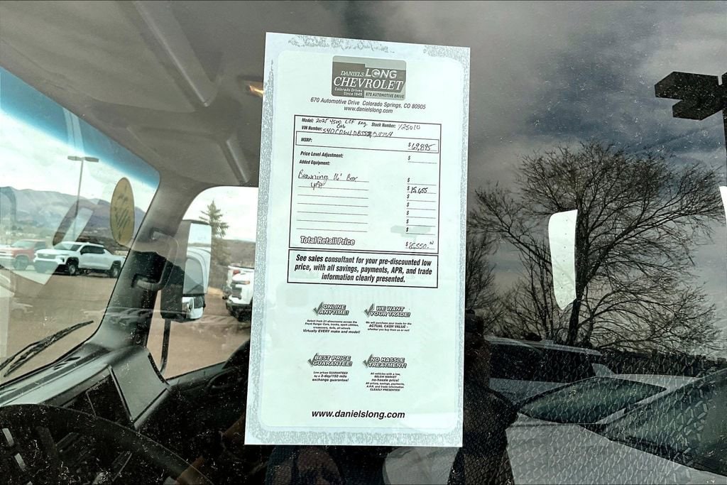 Preferred Equipment Group 1WT, 19.5 x 6 Steel Wheels, 2 Speakers, 2 Speakers Audio System Feature, 4-Wheel Disc Brakes, ABS brakes, Air Conditioning, AM/FM radio, Bumpers: body-color, CD player, Driver door bin, Dual rear wheels, Front anti-roll bar, Front Bucket Seats, Front Center Armrest, High Back Front Bucket Seats, Limited-Slip Axle, Overhead console, Passenger door bin, Power steering, Power windows, Remote Keyless Entry, Single-Zone Manual Air Conditioning, Speed control, Tachometer, Telescoping steering wheel, Tilt steering wheel, Tricot Cloth Seat Trim, and Trip computer. Price includes: $1750 - Customer Cash. Exp. 01/02/2026