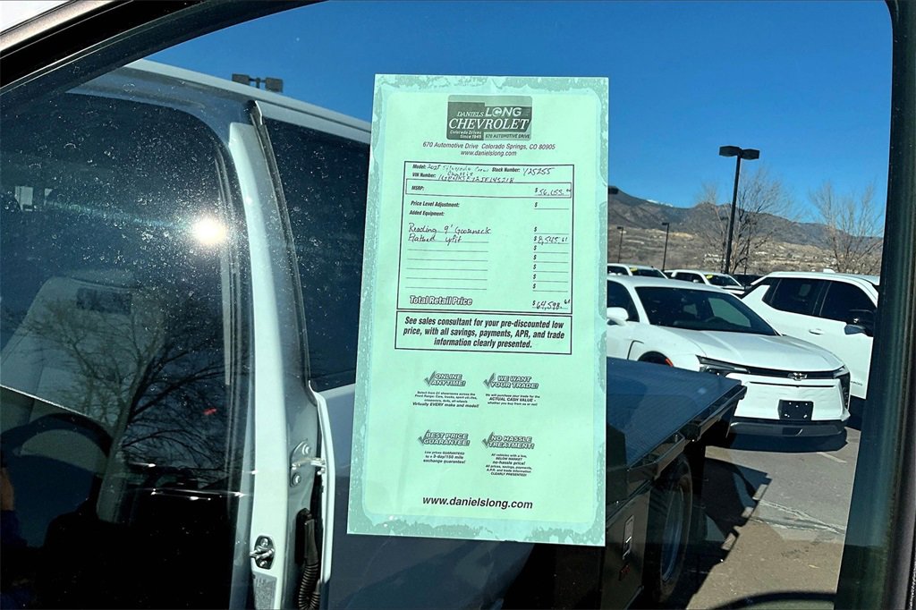 Preferred Equipment Group 1WT (170 Amp Alternator, 2-Speed Electronic Shift Transfer Case, 3.5 Diagonal Monochromatic Display DIC, Black Front Bumper, Black Mirror Caps, Bluetooth® For Phone, Compass Located In Instrument Cluster, High-Visibility Molded in Black Outside Mirrors, Manual Tilt-Wheel Steering Column, Power Rear Windows w/Express Down, Rear 60/40 Folding Bench Seat (Folds Up), Rubberized-Vinyl Floor Covering, Solar Absorbing Tinted Glass, and Steering Wheel Mounted Electronic Cruise Control), Snow Plow Prep Package (220 Amp Alternator), Suspension Package, WT Convenience Package (Deep-Tinted Glass and Electric Rear-Window Defogger), 10-Speed Automatic, 4WD, Black Cloth, 120-Volt (400 Watts) Interior Power Outlet, 17 Painted Steel Wheels, 18 Painted Steel Wheels, 3.73 Rear Axle Ratio, 4-Way Manual Driver Seat Adjuster, 4-Way Manual Passenger Seat Adjuster, 4-Wheel Disc Brakes, 6 Speakers, 6-Speaker Audio System Feature, ABS brakes, Air Conditioning, AM/FM radio, Auto High-beam Headlights, Auto-Dimming Inside Rear-View Mirror, Brake assist, Compass, Delay-off headlights, Driver door bin, Dual front impact airbags, Dual front side impact airbags, Dual Rear USB Ports (Charge Only), Dual rear wheels, Electronic Stability Control, Front 40/20/40 Split-Bench Seat, Front anti-roll bar, Front Center Armrest w/Storage, Front Chrome Bumper, Front Grille Bar w/Black Mesh Inserts, Front License Plate Kit, Front reading lights, Front wheel independent suspension, Fully automatic headlights, Heavy-Duty 80 Amp-Hr Battery, Illuminated entry, Low tire pressure warning, Manual Tilt Inside Rearview Mirror, Occupant sensing airbag, OnStar Services Capable, Outside temperature display, Overhead airbag, Overhead console, Panic alarm, Passenger door bin, Passenger vanity mirror, Power steering, Power windows, Power-Adjustable Outside Mirrors, Radio: Chevrolet Infotainment 3 System, Rear reading lights, Remote keyless entry, Speed control, Split folding rear seat, Tachometer, Tilt steering wheel, Traction control, Trip computer, Upfitter Switch Kit (5), Variably intermittent wipers, Vinyl Seat Trim, and Voltmeter. Price includes: $1000 - Customer Cash. Exp. 12/01/2025