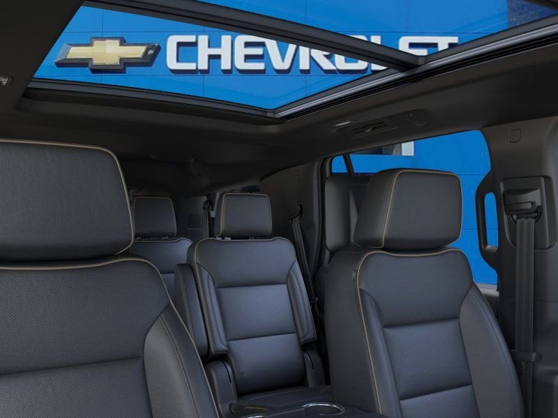 Advanced Security Package (Glass Breakage Sensor, Theft-Deterrent Alarm System, Vehicle Inclination Sensor, and Vehicle Interior Movement Sensor), Advanced Trailering Package (Blind Zone Steering Assist with Trailering, Hitch View with Pan/Zoom Image Adjustment, and Smart Trailer Integration Indicator), License Plate Front Mounting Package, Max Trailering Package (2-Speed Active Electronic AutoTrac Transfer Case, Hill Descent Control, and Integrated Trailer Brake Controller), Preferred Equipment Group 1LZ (1st and 2nd Row Color-Keyed Carpeted Floor Mats, 20 x 9 Polished Aluminum Wheels, 3-Spoke Wrapped Steering Wheel, 3rd Row 60/40 Power-Folding Split-Bench Seat, Auto-Dimming Inside Rear-View Mirror, Bose 10-Speaker Centerpoint Surround Audio System Feature, Bright Front and Rear Door Sill Plates, Chrome Door Handles with Body-Color Strip, Chrome Mirror Caps, Color-Keyed Carpeting Floor Covering, Dual Exhaust System, Floor Console, Front Bucket Seats, Front LED Fog Lamps, Frontal Driver and Outboard Passenger Airbags, Heated 2nd Row Outboard Seats, Heated Steering Wheel, Interior Camera, Key Card, LED Headlamps with LED Daytime Running Lamps, LED Tail Lamps, Magnetic Ride Control Suspension, Memory Settings, Outside Heated Power-Adjustable Mirrors, Power Release 2nd Row Bucket Seats, Power Tilt and Telescopic Steering Column, Rear Power Liftgate, Remote Start, SiriusXM with 360L Trial Subscription, Universal Home Remote, and Wireless Phone Charging), Technology & Entertainment Package (Dual-Pane Power Panoramic Sunroof and Rear Seat Media System), Technology Package (15 Diagonal Multi-Color Head-Up Display, AutoSense Hands-Free Power Liftgate, and Inside Rearview Auo-Dimming Rear Camera Mirror), 4WD, Jet Black Leather, 10 Speakers, 3.23 Rear Axle Ratio, 3rd row seats: split-bench, 4-Way Power Driver Lumbar Seat Adjuster, 4-Way Power Front Passenger Lumbar Seat Adjuster, 4-Wheel Disc Brakes, 8-Way Power Driver Seat Adjuster, 8-Way Power Front Passenger Seat Adjuster, ABS brakes, Adaptive suspension, Air Conditioning, Alloy wheels, AM/FM radio: SiriusXM with 360L, Apple CarPlay/Android Auto, Auto High-beam Headlights, Auto-dimming door mirrors, Auto-dimming Rear-View mirror, Auto-leveling suspension, Automatic temperature control, Brake assist, Bumpers: body-color, Compass, Delay-off headlights, Driver and Front Passenger Heated and Ventilated Seats, Driver door bin, Driver vanity mirror, Dual front impact airbags, Dual front side impact airbags, Electronic Stability Control, Emergency communication system: OnStar and Chevrolet connected services capable, Exterior Parking Camera Rear, Extra Capacity Cooling System, Four wheel independent suspension, Front anti-roll bar, Front Center Armrest, Front dual zone A/C, Front fog lights, Front reading lights, Fully automatic headlights, Garage door transmitter, Heated door mirrors, Heated Driver and Front Passenger Seats, Heated front seats, Heated rear seats, Heated steering wheel, Illuminated entry, Illuminated Liftgate Sill Plate, Low tire pressure warning, Memory seat, Mobile Service Plus - 3 Years, Navigation system: Google built-in compatibility (select service plan required, terms and limitations apply), Occupant sensing airbag, Outside temperature display, Overhead airbag, Overhead console, Panic alarm, Passenger door bin, Passenger vanity mirror, Perforated Leather Seat Trim, Power door mirrors, Power driver seat, Power Liftgate, Power passenger seat, Power steering, Power windows, Premium audio system: Chevrolet Infotain