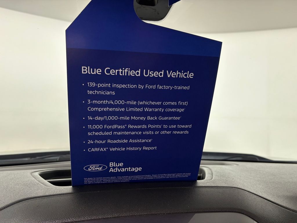 139 point vehicle inspection performed by an ASE Certified technician 3-month/4,000-mile Comprehensive Limited Warranty coverage that is fully competitive with other online retailers Blue Certification includes 11,000 FordPass Rewards Points For other manufacturers not listed above, Comprehensive Coverage is provided for 3 months or 4,000 miles, whichever comes first, from the signature date of the Ford Blue Advantage â" Blue Certified purchase. Comprehensive Limited Warranty covering 1,000+ components Travel expense reimbursement Rental car reimbursement SiriusXM 3 month tria. Recent Arrival!