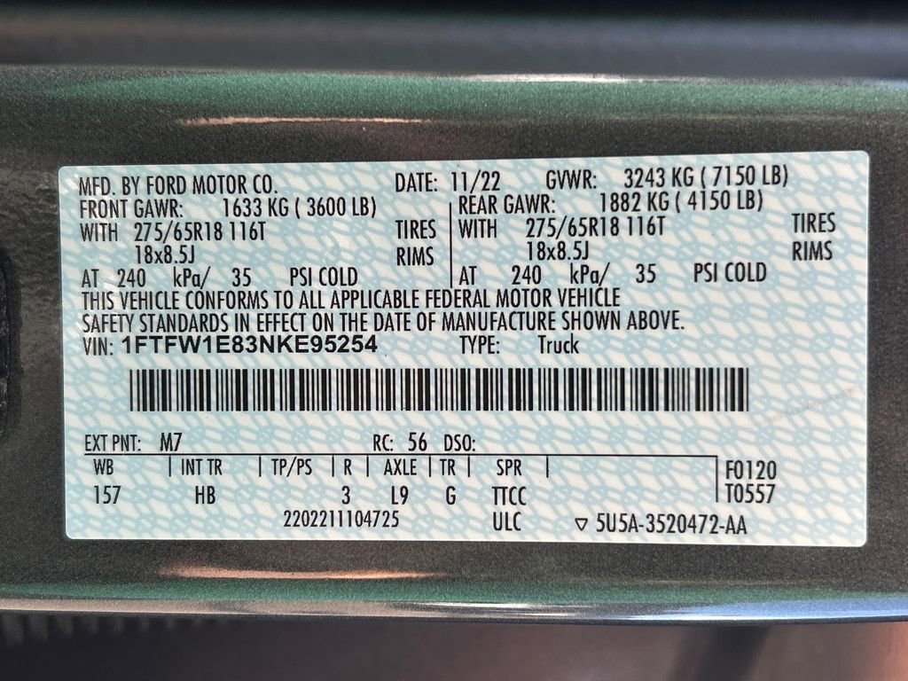 Elevate your driving experience with this exceptional 2022 Ford F-150 Lariat. Boasting a powerful 3.5L V6 EcoBoost engine, this truck delivers impressive performance and efficiency, with an EPA-estimated 17 city/23 highway MPG. Equipped with a 10-speed automatic transmission and 4-wheel drive, this F-150 is ready to tackle any terrain with confidence.Key features include: MAX TRAILER TOW PACKAGE LARIAT SPORT APPEARANCE PACKAGE EQUIPMENT GROUP 501A MID BED UTILITY PACKAGE 360 DEGREE CAMERAThis Lariat model also comes equipped with a host of premium amenities, such as the B&O Sound System by Bang & Olufsen, a power tailgate, and a 400W onboard outlet. The black, leather-trimmed bucket seats offer both heated and ventilated functionality, ensuring your comfort in any weather.Designed to handle the demands of your active lifestyle, the F-150 Lariat boasts a suite of advanced safety features, including a 360-degree camera, electronic locking with a 3.55 axle ratio, and an extended-range 36-gallon fuel tank. The power telescoping, glass, and folding trailer tow mirrors provide enhanced visibility and convenience when towing.This truck's rugged good looks are complemented by the Lariat Sport Appearance Package, which includes unique interior finishes, box side decals, a chrome single-tip exhaust, and accent-color angular step bars. The dark two-bar and one-minor-bar style grille with a black surround and black mesh adds a bold, distinctive flair.Whether you're tackling tough jobs or embarking on weekend adventures, this 2022 Ford F-150 Lariat is the ultimate companion. Experience the power, capability, and premium features that make this truck a standout in its class. Visit our showroom today and let us demonstrate how this F-150 can elevate your driving experience.