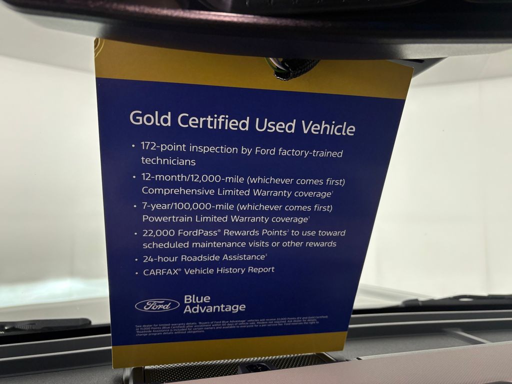 172 point vehicle inspection performed by a Ford Certified technician. 12-month/12,000-mile Comprehensive Limited Warranty coverage 7-year/100,000-mile Powertrain Limited Warranty coverage Gold Certification includes 22,000 FordPass Rewards Points Comprehensive Coverage: 12 months or 12,000 miles, whichever comes first, from the expiration of the new-vehicle bumperto-bumper limited warranty coverage or the date of sale as a certified vehicle, whichever is later. Comprehensive Limited Warranty covering 1,000+ components. Powertrain Coverage: 7 years from original new-vehicle warranty start date or 100,000 miles, whichever occurs first. Powertrain Limited Warranty covering select major components. 24/7 Roadside Assistance Travel expense reimbursement Rental car reimbursement SiriusXM 3 month trial Local home delivery Test-Drive at home. Recent Arrival! Odometer is 10033 miles below market average!