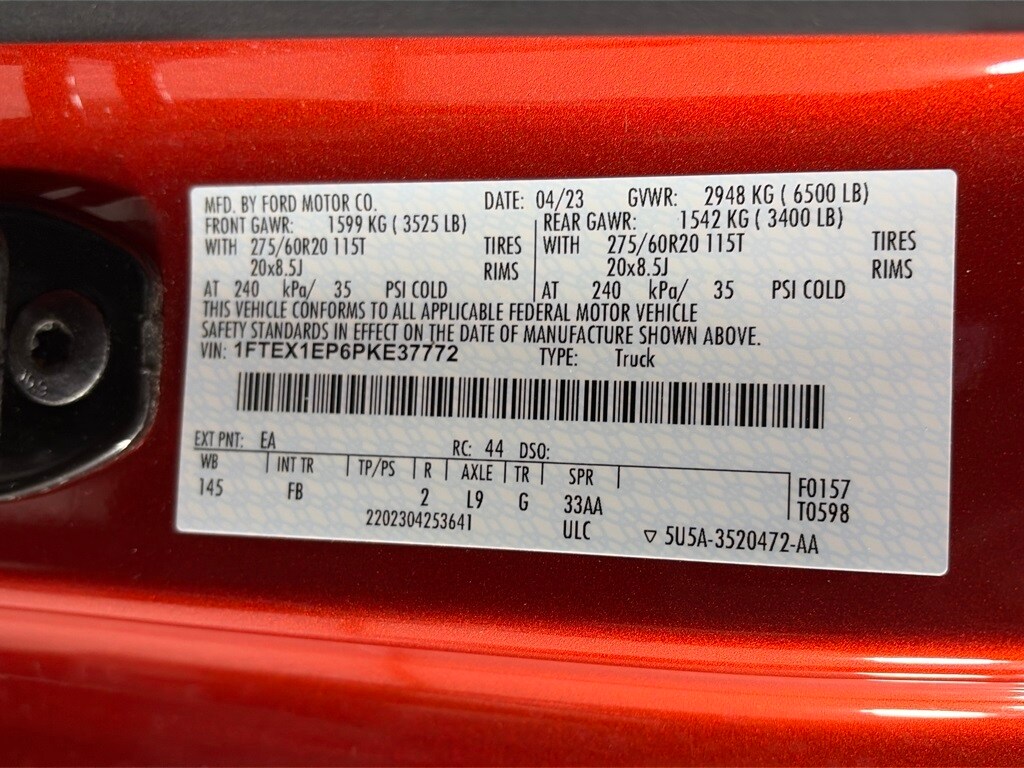 EQUIPMENT GROUP 302A HIGH Class IV Trailer Hitch Receiver, towing capability up to TBD lbs, on 3.3L V6 PFDI engine (99B) and 2.7L EcoBoost engine (99P) or up to TBD lbs, on 3.5L EcoBoost engine (998) and 5.0L V8 engine (995), 7/4-pin connector, class IV trailer hitch receiver, smart trailer tow connector ( BLIS w/trailer tow coverage where BLIS is available), XLT Chrome Appearance Package, lower grille trim, Chrome Single-Tip Exhaust, Tires: 275/65R18 BSW Automatic Transmission, Chrome Door & Tailgate Handles w/Body-Color Bezel, bezel on side doors and black on tailgate, Wheels: 18 Chrome-Like PVD, 2-Bar Style Grille w/Chrome 2 Minor Bars, silver painted surround and black background mesh, Bright Polished Step Bars, Zone Lighting, Intelligent Access w/Push Button Start, approach detection, SecuriCode, WHEELS: 20 6-SPOKE DARK ALLOY PAINTED ALUMINUM Tires: 275/60R20 BSW AT, ENGINE: 2.7L V6 ECOBOOST 3.55 Axle Ratio, GVWR: 6,500 lbs Payload Package, ELECTRONIC LOCKING W/3.55 AXLE RATIO, XLT SPORT APPEARANCE PACKAGE body-color wheellip moldings and unique interior finish, Box Side Decals, Chrome Single-Tip Exhaust, Body-Color Door & Tailgate Handles, body-color bezel on side doors and black on tailgate, Tires: 275/65R18 BSW Automatic Transmission, Wheels: 18 6-Spoke Machined Aluminum, gloss black painted pockets, Accent-Color Step Bars, Body-Color Front & Rear Bumpers, body-color front fascia, Black 2-Bar Style Grille w/Black Surround/Accents, TRANSMISSION: ELECTRONIC 10-SPEED AUTOMATIC selectable drive modes: normal, ECO, sport, tow/haul, slippery, deep snow/sand and mud/rut (STD). Ford XLT with Hot Pepper Red Tinted Clearcoat exterior and Black interior features a V6 Cylinder Engine with 290 HP at 6500 RPM*.