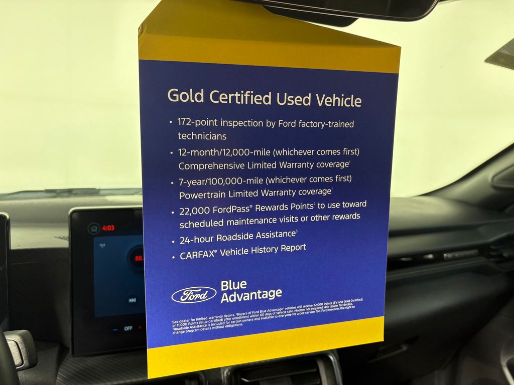 172 point vehicle inspection performed by a Ford Certified technician. 12-month/12,000-mile Comprehensive Limited Warranty coverage 7-year/100,000-mile Powertrain Limited Warranty coverage Gold Certification includes 22,000 FordPass Rewards Points Comprehensive Coverage: 12 months or 12,000 miles, whichever comes first, from the expiration of the new-vehicle bumperto-bumper limited warranty coverage or the date of sale as a certified vehicle, whichever is later. Comprehensive Limited Warranty covering 1,000+ components. Powertrain Coverage: 7 years from original new-vehicle warranty start date or 100,000 miles, whichever occurs first. Powertrain Limited Warranty covering select major components. 24/7 Roadside Assistance Travel expense reimbursement Rental car reimbursement SiriusXM 3 month trial Local home delivery Test-Drive at home. Recent Arrival! 21/32 City/Highway MPG