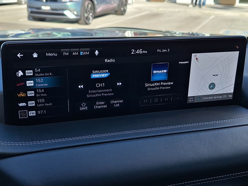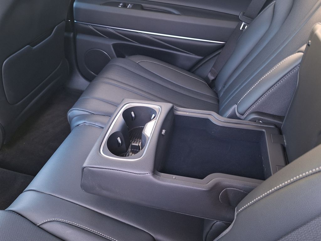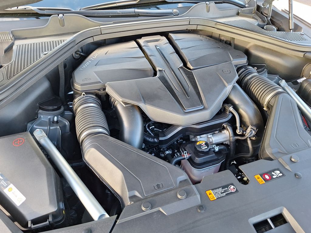Option Group 01, 12 Speakers, 3.909 Axle Ratio, 4-Wheel Disc Brakes, ABS brakes, Adaptive suspension, Air Conditioning, Alloy wheels, AM/FM radio: SiriusXM, Android Auto & Apple CarPlay, Anti-whiplash front head restraints, Auto High-beam Headlights, Auto tilt-away steering wheel, Auto-dimming door mirrors, Auto-dimming Rear-View mirror, Automatic temperature control, Brake assist, Bumpers: body-color, Compass, Delay-off headlights, Driver door bin, Driver vanity mirror, Dual front impact airbags, Dual front side impact airbags, Electronic Stability Control, Emergency communication system: Genesis Connected Services, Exterior Parking Camera Rear, Four wheel independent suspension, Front anti-roll bar, Front Bucket Seats, Front Center Armrest, Front dual zone A/C, Front reading lights, Fully automatic headlights, Garage door transmitter: HomeLink, Genuine wood console insert, Genuine wood dashboard insert, Genuine wood door panel insert, Heated & Ventilated Front Bucket Seats, Heated door mirrors, Heated front seats, Heated steering wheel, Illuminated entry, Knee airbag, Leather steering wheel, Leatherette Seating Surfaces, Low tire pressure warning, Memory seat, Nappa Leather Seating Surfaces, Navigation System, Occupant sensing airbag, Outside temperature display, Overhead airbag, Overhead console, Panic alarm, Passenger door bin, Passenger vanity mirror, Power door mirrors, Power driver seat, Power Liftgate, Power moonroof, Power passenger seat, Power steering, Power windows, Radio data system, Radio:14.5" Navigation System w/AM/FM/HD Radio, Rain sensing wipers, Rear air conditioning, Rear anti-roll bar, Rear reading lights, Rear seat center armrest, Rear side impact airbag, Rear window defroster, Rear window wiper, Remote keyless entry, Security system, Speed control, Speed-sensing steering, Speed-Sensitive Wipers, Split folding rear seat, Spoiler, Steering wheel memory, Steering wheel mounted audio controls, Tachometer, Telescoping steering wheel, Tilt steering wheel, Traction control, Trip computer, Turn signal indicator mirrors, Variably intermittent wipers, Ventilated front seats, and Wheels: 20" x 8.5J Medium Metallic Gray Alloy.