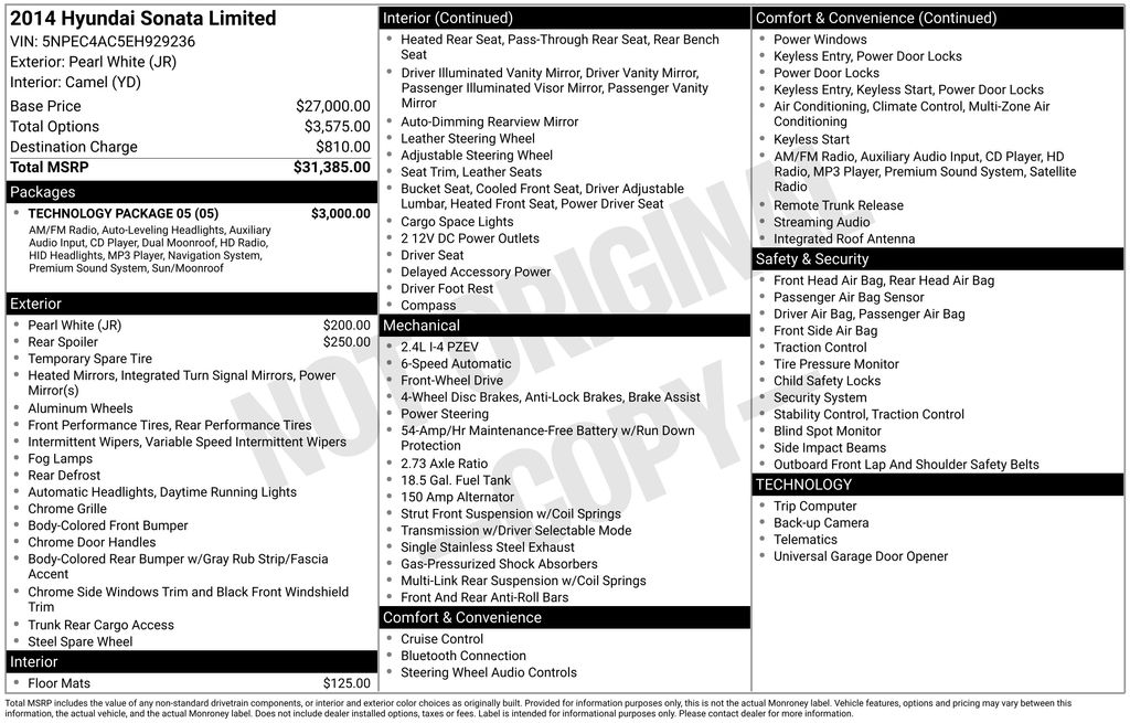 Technology Package 05 (High-Intensity Discharge Xenon Headlights, LED Taillights, Panoramic Tilt & Slide Front Sunroof, and Radio: AM/FM/SiriusXM/CD/MP3 w/Navigation), Camel Leather, 17 x 6.5J Aluminum Alloy Wheels, 4-Wheel Disc Brakes, 7 Speakers, ABS brakes, Air Conditioning, Alloy wheels, AM/FM radio: SiriusXM, Anti-whiplash front head restraints, Auto-dimming Rear-View mirror, Automatic temperature control, Brake assist, Bumpers: body-color, Carpeted Floor Mats, CD player, Compass, Delay-off headlights, Driver door bin, Driver vanity mirror, Dual front impact airbags, Dual front side impact airbags, Electronic Stability Control, Emergency communication system: Blue Link, Exterior Parking Camera Rear, Four wheel independent suspension, Front anti-roll bar, Front Bucket Seats, Front Center Armrest w/Storage, Front dual zone A/C, Front fog lights, Front reading lights, Fully automatic headlights, Garage door transmitter: HomeLink, Heated door mirrors, Heated Front Bucket Seats, Heated front seats, Heated rear seats, Illuminated entry, Leather Seating Surfaces, Leather steering wheel, Low tire pressure warning, Occupant sensing airbag, Outside temperature display, Overhead airbag, Overhead console, Panic alarm, Passenger door bin, Passenger vanity mirror, Power door mirrors, Power driver seat, Power moonroof, Power steering, Power windows, Radio: AM/FM/SiriusXM/CD/MP3 Audio System, Rear anti-roll bar, Rear Lip Spoiler, Rear seat center armrest, Rear window defroster, Remote keyless entry, Security system, Speed control, Speed-sensing steering, Speed-Sensitive Wipers, Split folding rear seat, Steering wheel mounted audio controls, Tachometer, Telescoping steering wheel, Tilt steering wheel, Traction control, Trip computer, Turn signal indicator mirrors, Variably intermittent wipers, and Ventilated front seats.