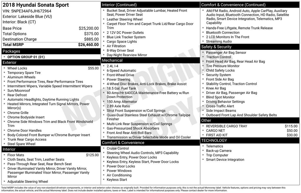 Option Group 01, Black Leather, 4-Wheel Disc Brakes, 6 Speakers, ABS brakes, Air Conditioning, Alloy wheels, AM/FM radio: SiriusXM, Apple CarPlay & Android Auto, Brake assist, Bumpers: body-color, Cargo Net, Carpeted Floor Mats, Delay-off headlights, Driver door bin, Driver vanity mirror, Dual front impact airbags, Dual front side impact airbags, Electronic Stability Control, Emergency communication system: Blue Link, Exterior Parking Camera Rear, First Aid Kit, Four wheel independent suspension, Front anti-roll bar, Front Bucket Seats, Front Center Armrest, Front reading lights, Fully automatic headlights, Heated door mirrors, Heated front seats, Heated Front Sport Seats, Illuminated entry, Knee airbag, Leather Bolster/Cloth Insert Seating Surfaces, Leather Shift Knob, Leather steering wheel, Low tire pressure warning, Occupant sensing airbag, Outside temperature display, Overhead airbag, Overhead console, Panic alarm, Passenger door bin, Passenger vanity mirror, Power door mirrors, Power driver seat, Power moonroof, Power steering, Power windows, Radio data system, Radio: AM/FM/HD/SiriusXM/MP3 Display Audio, Rear anti-roll bar, Rear seat center armrest, Rear window defroster, Remote keyless entry, Reversible Cargo Tray, Security system, Speed control, Speed-sensing steering, Speed-Sensitive Wipers, Split folding rear seat, Sport steering wheel, Steering wheel mounted audio controls, Tachometer, Telescoping steering wheel, Tilt steering wheel, Traction control, Trip computer, Turn signal indicator mirrors, Variably intermittent wipers, Wheel Locks, and Wheels: 17 x 7.0J Aluminum Alloy.
