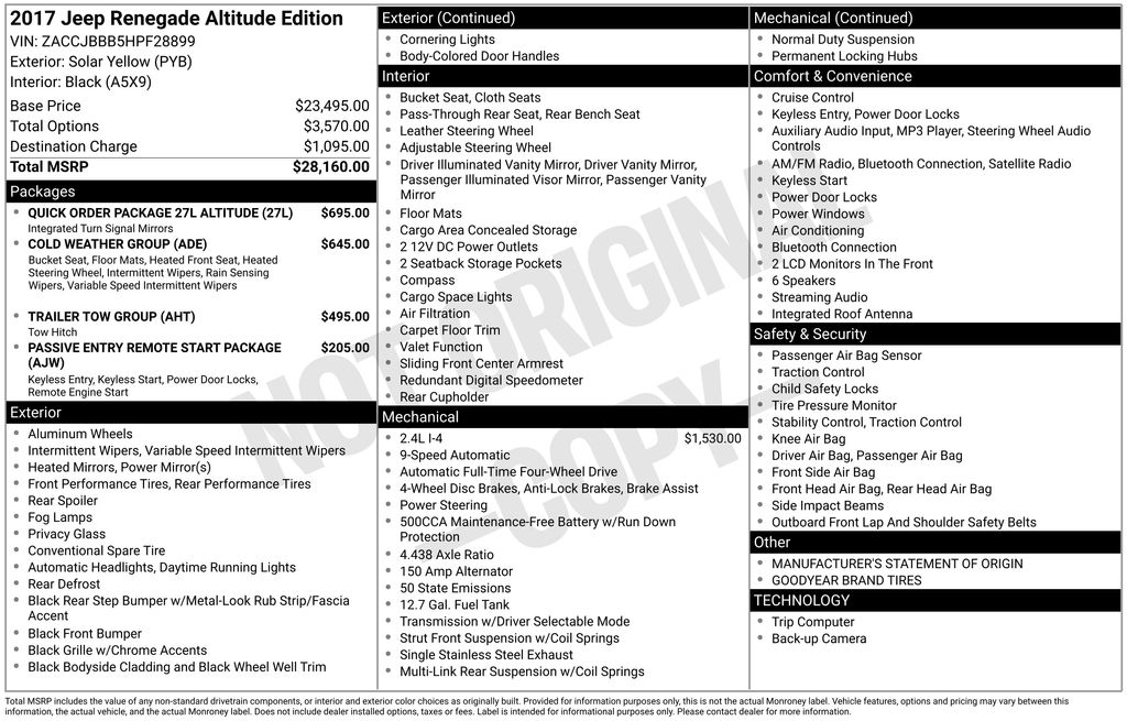 Altitude Package, Cold Weather Group (All-Season Floor Mats, Heated Front Seats, Heated Steering Wheel, PTC Auxiliary Interior Heater, Rain Sensitive Windshield Wipers, and Windshield Wiper De-Icer), Passive Entry Remote Start Package (Passive Entry/Keyless Go), Quick Order Package 27L Altitude (Black Day Light Opening Moldings, Deluxe Cloth High-Back Bucket Seats, Exterior Mirrors w/Supplemental Signals, Gloss Black Badging, Gloss Black Fascia Applique, Gloss Black Instrument Panel Bezels, Vinyl Door Trim Panel, and Wheels: 18" x 8.0" Gloss Black), Trailer Tow Group (4 Pin Wiring Harness and Class III Receiver Hitch), 16" x 6.5" Aluminum Wheels, 4-Wheel Disc Brakes, 6 Speakers, ABS brakes, Air Conditioning, Alloy wheels, AM/FM radio: SiriusXM, Anti-whiplash front head restraints, Brake assist, Cloth Low-Back Bucket Seats, Compass, Delay-off headlights, Driver door bin, Driver vanity mirror, Dual front impact airbags, Dual front side impact airbags, Electronic Stability Control, Four wheel independent suspension, Front anti-roll bar, Front Bucket Seats, Front Center Armrest, Front fog lights, Front reading lights, Fully automatic headlights, Goodyear Brand Tires (DISC), Heated door mirrors, Illuminated entry, Knee airbag, Leather steering wheel, Low tire pressure warning, Manufacturer's Statement of Origin, Normal Duty Suspension, Occupant sensing airbag, Outside temperature display, Overhead airbag, Overhead console, Panic alarm, ParkView Rear Back-Up Camera, Passenger door bin, Passenger vanity mirror, Power door mirrors, Power steering, Power windows, Radio data system, Radio: Uconnect 3 w/5" Display, Rear anti-roll bar, Rear window defroster, Rear window wiper, Remote keyless entry, Roof rack: rails only, Speed control, Split folding rear seat, Spoiler, Steering wheel mounted audio controls, Tachometer, Telescoping steering wheel, Tilt steering wheel, Traction control, Trip computer, Variably intermittent wipers, and Voltmeter.