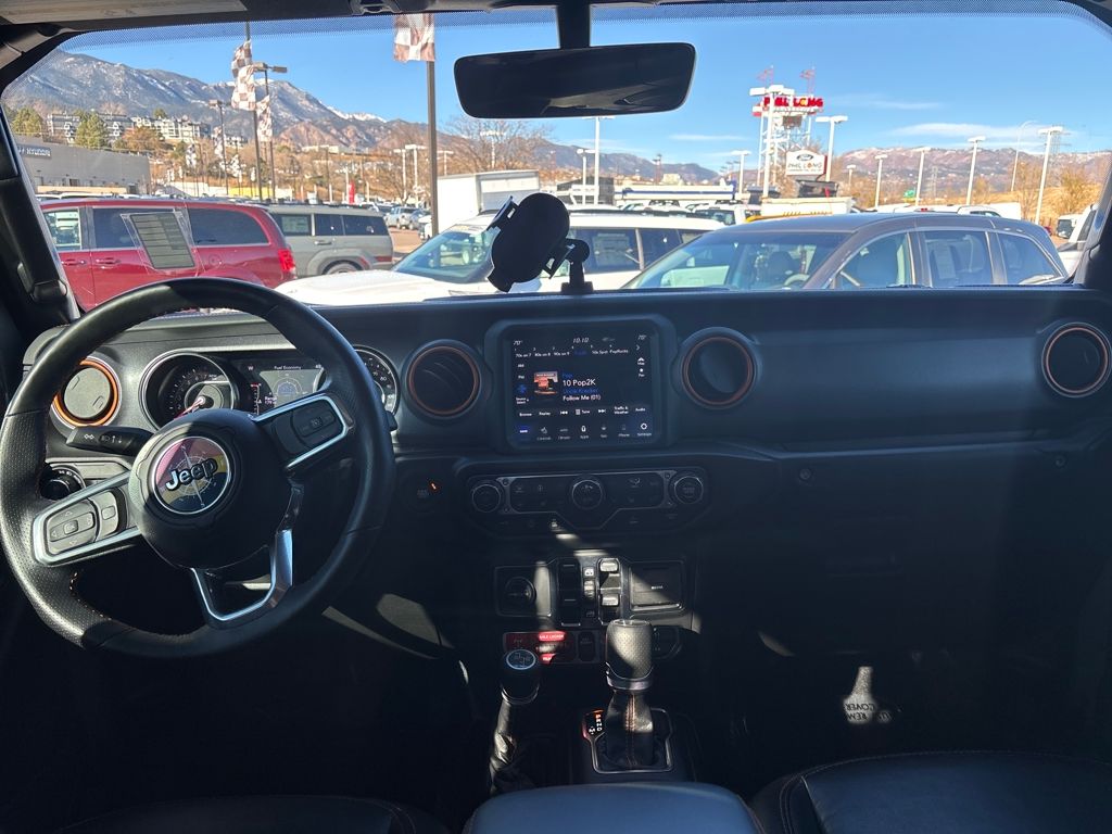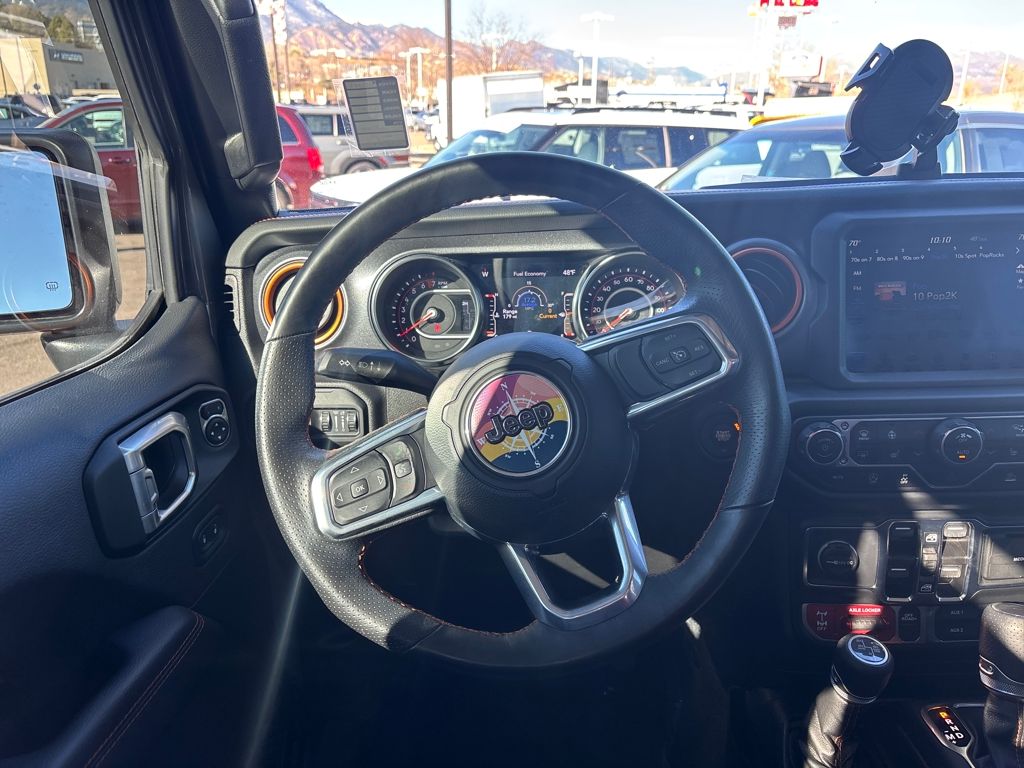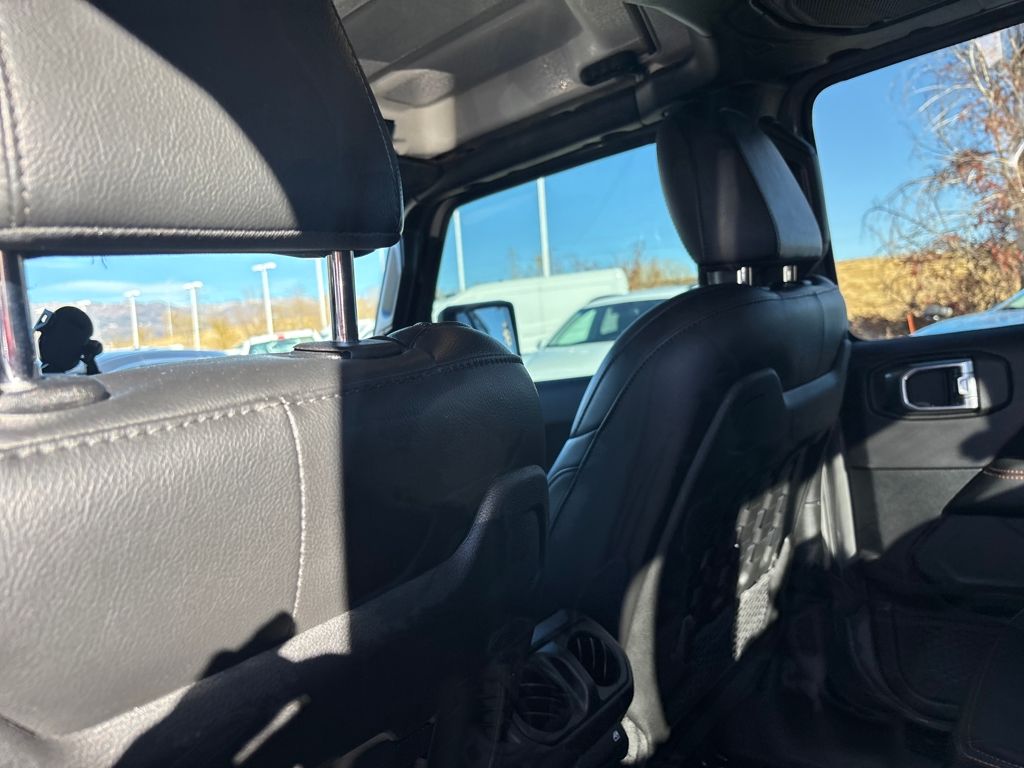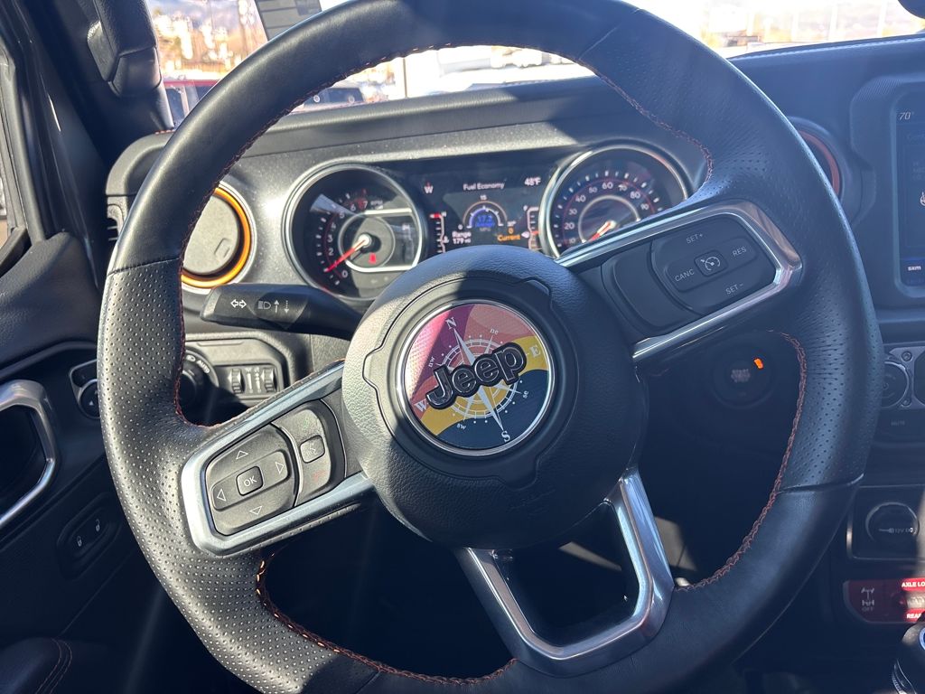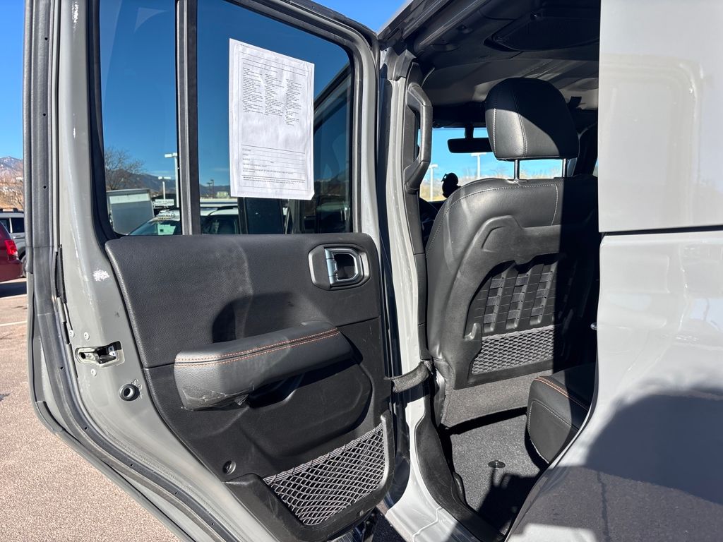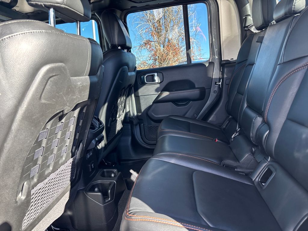Auxiliary Switch Group (240 Amp Alternator, 700 Amp Maintenance Free Battery, and Auxiliary Switches), Cold Weather Group (Heated Front Seats and Heated Steering Wheel), Quick Order Package 24D, Trail Rail Management System (Exterior 115V AC Outlet and Lockable Rear Underseat Storage), Trailer Tow Package (Class IV Receiver Hitch, Heavy-Duty Engine Cooling, and Trailer Hitch Zoom), 4-Wheel Disc Brakes, 4.10 Rear Axle Ratio, 9 Speakers, 97 MPH Vehicle Max Speed Calibration, ABS brakes, Air Conditioning, Alloy wheels, AM/FM radio: SiriusXM, Apple CarPlay/Android Auto, Auto-dimming Rear-View mirror, Automatic temperature control, Bluetooth Wireless Speaker, Body Color 3-Piece Hard Top, Body Color Fender Flares (2-Piece), Brake assist, Compass, Corning Gorilla Glass, Delay-off headlights, Driver door bin, Driver vanity mirror, Dual front impact airbags, Dual front side impact airbags, Electronic Stability Control, Emergency communication system: SiriusXM Guardian, Freedom Panel Storage Bag, Front anti-roll bar, Front Bucket Seats, Front Center Armrest w/Storage, Front dual zone A/C, Front fog lights, Front License Plate Bracket, Front reading lights, Fully automatic headlights, Garage door transmitter, Heated door mirrors, Heavy Duty Suspension w/Gas Shocks, Illuminated entry, Integrated Off-Road Camera, Integrated roll-over protection, Jeep Trail Rated Kit, Leather steering wheel, Low tire pressure warning, MOPAR All-Weather Slush Mats, MOPAR Spray In Bedliner, Navigation System, No Soft Top, Occupant sensing airbag, Outside temperature display, Panic alarm, ParkView Rear Back-Up Camera, Passenger door bin, Passenger vanity mirror, Power door mirrors, Power steering, Power windows, Premium Cloth Seats w/Sport Bolsters, Radio data system, Radio: Uconnect 4C Nav w/8.4" Display, Rear anti-roll bar, Rear reading lights, Rear Sliding Window, Rear Window Defroster, Remote keyless entry, Remote Start System, Security system, Selec-Trac Full Time 4WD System, Speed control, Split folding rear seat, Steering wheel mounted audio controls, Tachometer, Telescoping steering wheel, Tilt steering wheel, Traction control, Trip computer, Variably intermittent wipers, Voltmeter, Wheels: 17" x 7.5" Low Gloss Black Aluminum, and Wheels: 17" x 7.5" Low Gloss Black Polished.