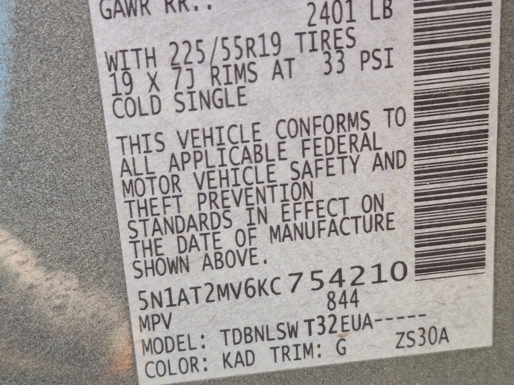 - Front tires: 225/55VR19.0