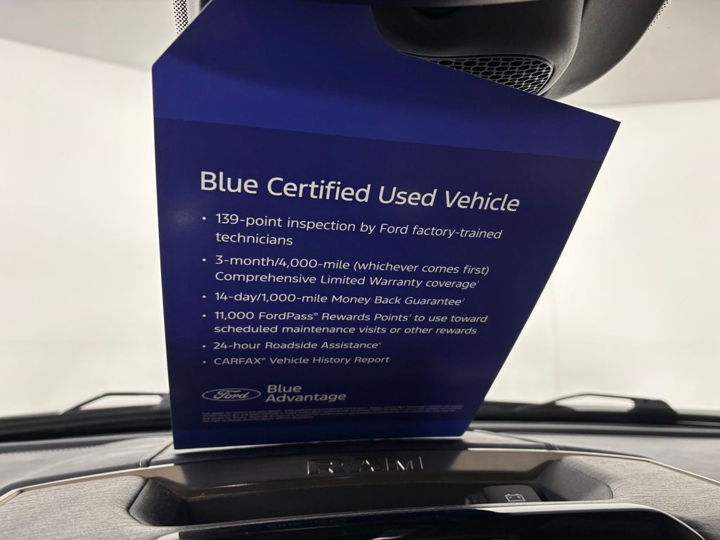 Ford Blue Certified includes:139 point vehicle inspection performed by an ASE Certified technician 3-month/4,000-mile Comprehensive Limited Warranty coverage that is fully competitive with other online retailers Blue Certification includes 11,000 FordPass Rewards Points For other manufacturers not listed above, Comprehensive Coverage is provided for 3 months or 4,000 miles, whichever comes first, from the signature date of the Ford Blue Advantage â" Blue Certified purchase. Comprehensive Limited Warranty covering 1,000+ components Travel expense reimbursement Rental car reimbursement SiriusXM 3 month trial.