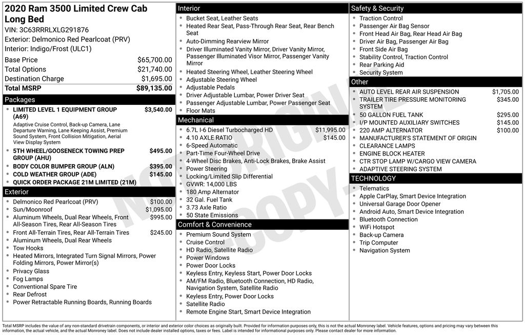 The **2020 Ram 3500 Limited Crew Cab 4x4 8 Box** is a remarkable blend of luxury and power, especially when equipped with the **Limited Level 1 Equipment Group**, **Dual Rear Wheels**, **Body Color Bumper Group**, **Cold Weather Group**, **Protection Group**, and **Quick Order Package 21M Limited**. This truck is engineered to deliver an exceptional driving experience while tackling heavy-duty tasks with ease.