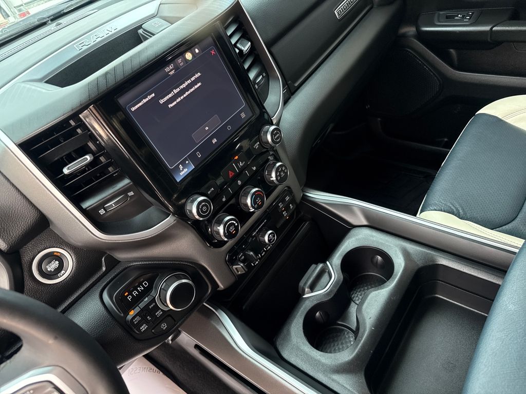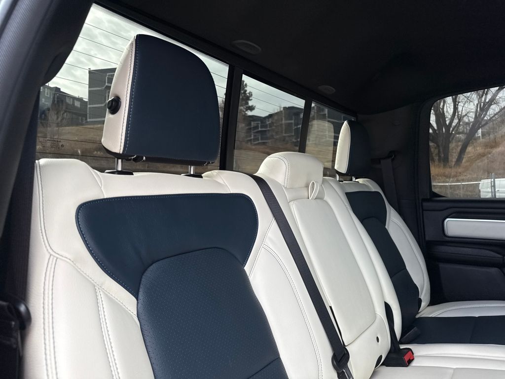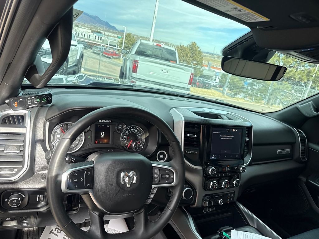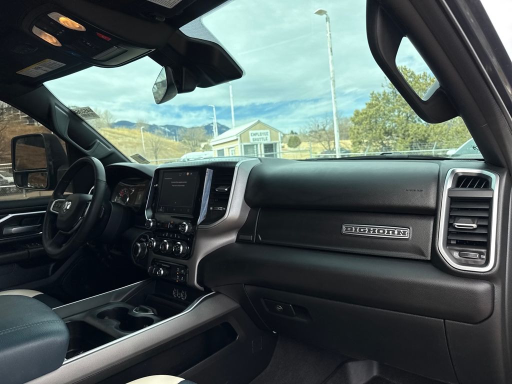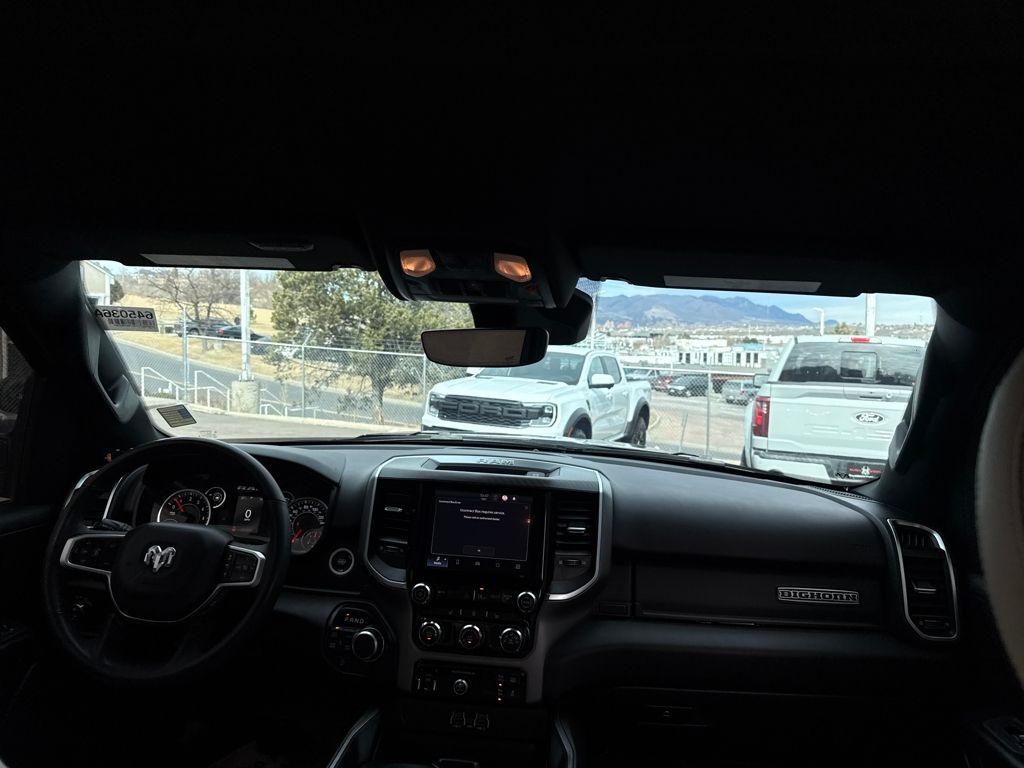 Bed Utility Group (Exterior 115V AC Outlet, MOPAR 4 Adjustable Cargo Tie-Down Hooks, MOPAR Spray In Bedliner, and Pick-Up Box Lighting), Big Horn Level 1 Equipment Group (115V Auxiliary Power Outlet, 2nd Row In Floor Storage Bins, 400W Inverter, Auto Power-Folding Mirrors, Auto-Dimming Exterior Driver Mirror, Auto-Dimming Rear-View Mirror, Black Exterior Mirrors, Black Premium Power Mirrors, Convex Wide-Angle Exterior Mirror Insert, Exterior Mirrors Courtesy Lamps, Exterior Mirrors w/Heating Element, Exterior Mirrors w/Supplemental Signals, Glove Box Lamp, Heated Front Seats, Heated Steering Wheel, Leather Wrapped Steering Wheel, Power 2-Way Driver Lumbar Adjust, Power Adjust 8-Way Driver Seat, Power Adjustable Pedals, Rear Power Sliding Window, Rear Window Defroster, Steering Wheel Mounted Audio Controls, Sun Visors w/Illuminated Vanity Mirrors, and Universal Garage Door Opener), Protection Group (Tow Hooks), Quick Order Package 21Z Big Horn, Trailer Tow Group (Accent Color Tailgate Handle, Black Trailer Tow Power Mirrors, Manual Folding Exterior Mirrors, Manual Telescoping Mirrors, Mirror Clearance/Running Lights, Power-Adjustable Convex Aux Mirrors, Trailer Brake Control, Trailer Reverse Steering Control, Trailer Tire Pressure Monitoring System, and Trailer Tow Mirrors), 3 Rear Seat Head Restraints, 4 Way Front Headrests, 4-Wheel Disc Brakes, 4G LTE Wi-Fi Hot Spot, 6 Speakers, ABS brakes, Air Conditioning, Alloy wheels, AM/FM radio, Apple CarPlay/Android Auto, Auto High-beam Headlights, Brake assist, Bumpers: chrome, Cloth Bench Seat, Compass, Connectivity - US/Canada, Delay-off headlights, Driver door bin, Dual front impact airbags, Dual front side impact airbags, Electronic Stability Control, Front anti-roll bar, Front Center Armrest w/Storage, Front fog lights, Front License Plate Bracket, Front reading lights, Front Seat Back Map Pockets, Front wheel independent suspension, Fully automatic headlights, GPS Antenna Input, Heated door mirrors, Illuminated entry, Integrated Voice Command w/Bluetooth, Low tire pressure warning, Manual Adjust 4-Way Front Passenger Seat, Manufacturer's Statement of Origin, MOPAR Front & Rear Rubber Floor Mats, Occupant sensing airbag, Outside temperature display, Overhead airbag, Overhead console, Panic alarm, ParkView Rear Back-Up Camera, Passenger door bin, Passenger vanity mirror, Power door mirrors, Power steering, Power windows, Radio data system, Radio: Uconnect 5 W w/8.4" Display, RAM Grille Badge - Chrome, Rear 60/40 Folding Seat, Rear anti-roll bar, Rear seat center armrest, Rear step bumper, Remote keyless entry, Speed control, Split folding rear seat, Supplier Part Tracking (J-1), Tachometer, Telescoping steering wheel, Tilt steering wheel, Traction control, Trip computer, USB Host Flip, Variably intermittent wipers, Voltmeter, Wheels: 18" x 8" Cast-Aluminum Painted, and Wheels: 20" x 9" Aluminum Chrome Clad (WRK)