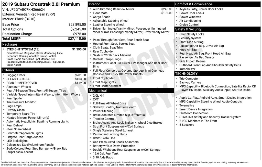 Venetian Red Pearl 2019 Subaru Crosstrek 2.0i Premium AWD Lineartronic CVT 2.0L DOHC 27/33 City/Highway MPG