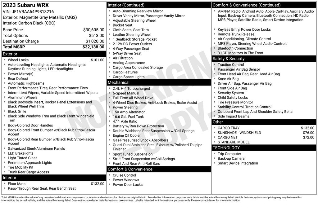 Standard Model, 4-Wheel Disc Brakes, 6 Speakers, ABS brakes, Air Conditioning, All-Weather Floor Liners, Alloy Wheel Locks, Alloy wheels, AM/FM radio: SiriusXM, Auto High-beam Headlights, Auto-dimming Rear-View mirror, Automatic temperature control, Brake assist, Bumpers: body-color, Cargo Net, Cargo Tray, Cloth Upholstery w/Red Stitching, Driver door bin, Driver vanity mirror, Dual front impact airbags, Dual front side impact airbags, Electronic Stability Control, Exterior Parking Camera Rear, Four wheel independent suspension, Front anti-roll bar, Front Bucket Seats, Front Center Armrest, Front reading lights, Fully automatic headlights, Illuminated entry, Knee airbag, Leather Shift Knob, Leather steering wheel, Low tire pressure warning, Occupant sensing airbag, Outside temperature display, Overhead airbag, Overhead console, Panic alarm, Passenger door bin, Passenger vanity mirror, Performance Design Front Bucket Seats, Power door mirrors, Power steering, Power windows, Radio data system, Radio: Subaru STARLINK Dual 7" Multimedia Plus Sys, Rear anti-roll bar, Rear window defroster, Remote keyless entry, Security system, Speed control, Speed-sensing steering, Split folding rear seat, Sport steering wheel, STARLINK/Apple CarPlay/Android Auto, Steering wheel mounted audio controls, Sunshade - Windshield, Tachometer, Telescoping steering wheel, Tilt steering wheel, Traction control, Trip computer, Variably intermittent wipers, and Wheels: 17" x 8" Gray Finish Aluminum Alloy.